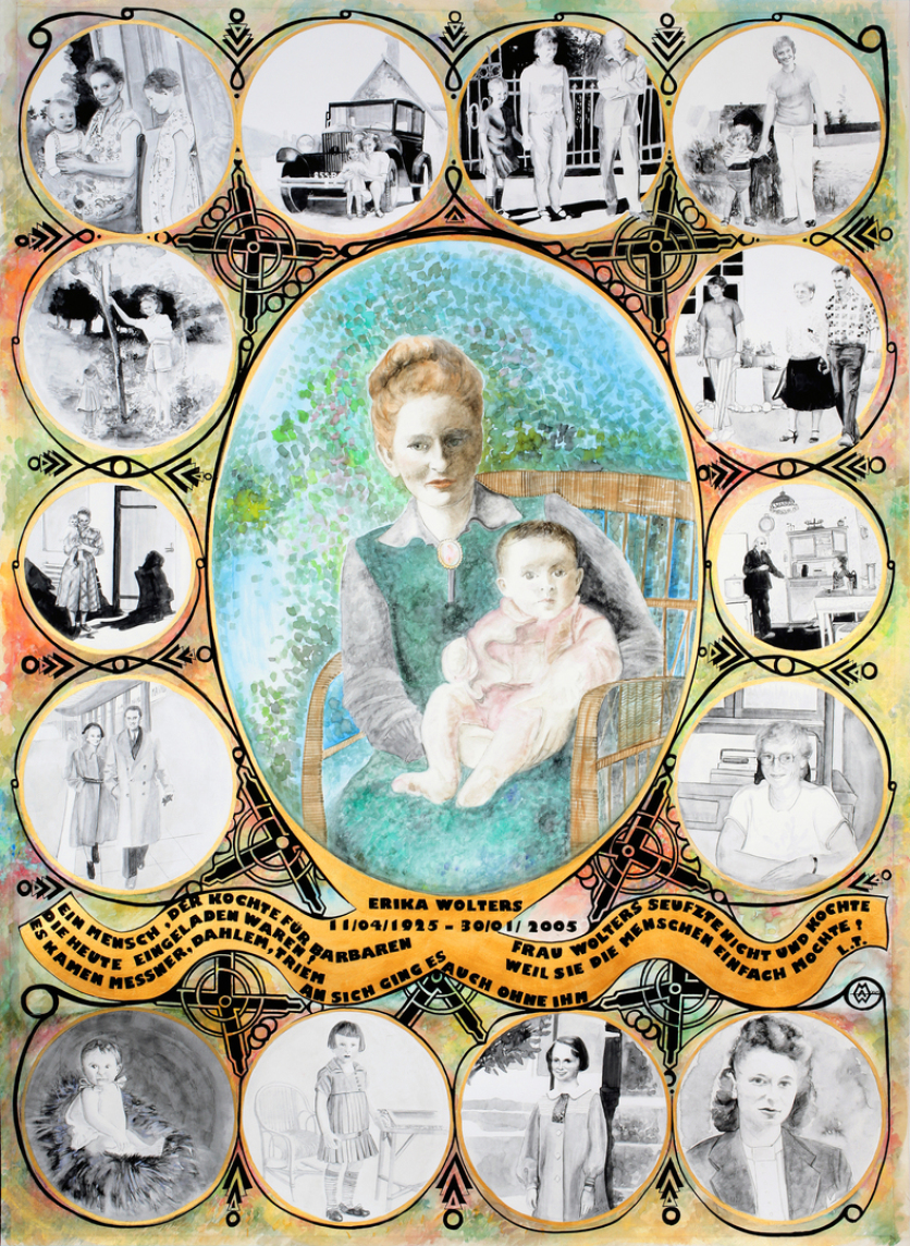 Erika Angélique WOLTERS née TILLY - 11/04/1925 - 30/01/2005 - Acrylique & aquarelle sur papier 84cmx110cm - 2014 . Titre : "Ein Mensch Der kochte für Barbaren die Heute eingeladen waren ! Es kamen MESSNER, DAHLEM,TRIEM, an sich ging es auch ohne Ihn. Frau WOLTERS seufzte nicht und kochte, weil Sie die Menschen einfach mochte ! "L.TRIEM.
