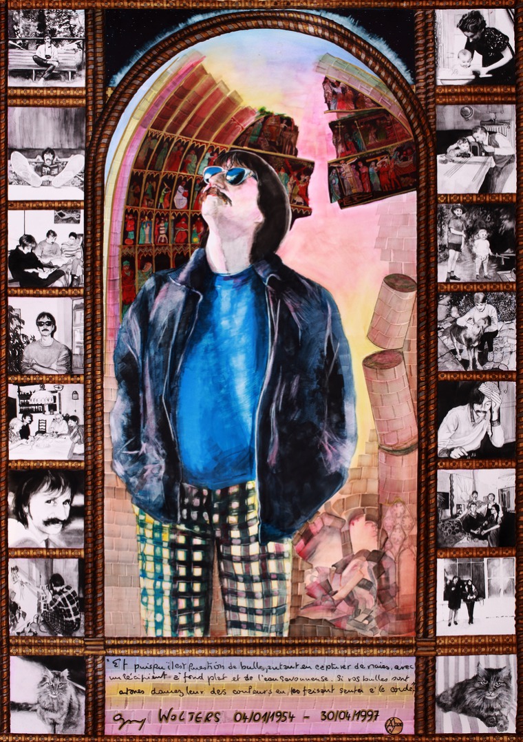 Guy Jacques Nicolas WOLTERS - 04/01/1954 - 30/04/1997. Acrylique & aquarelle sur papier, 84x110 cm, 2016 . Titre : " Et puisqu'il est question de bulles, autant en capturer de vraies avec un récipient à fond plat et de l'eau savonneuse. Si vos bulles sont atones, donnez leur des couleurs en les faisant sauter à la corde. " Guy Wolters.