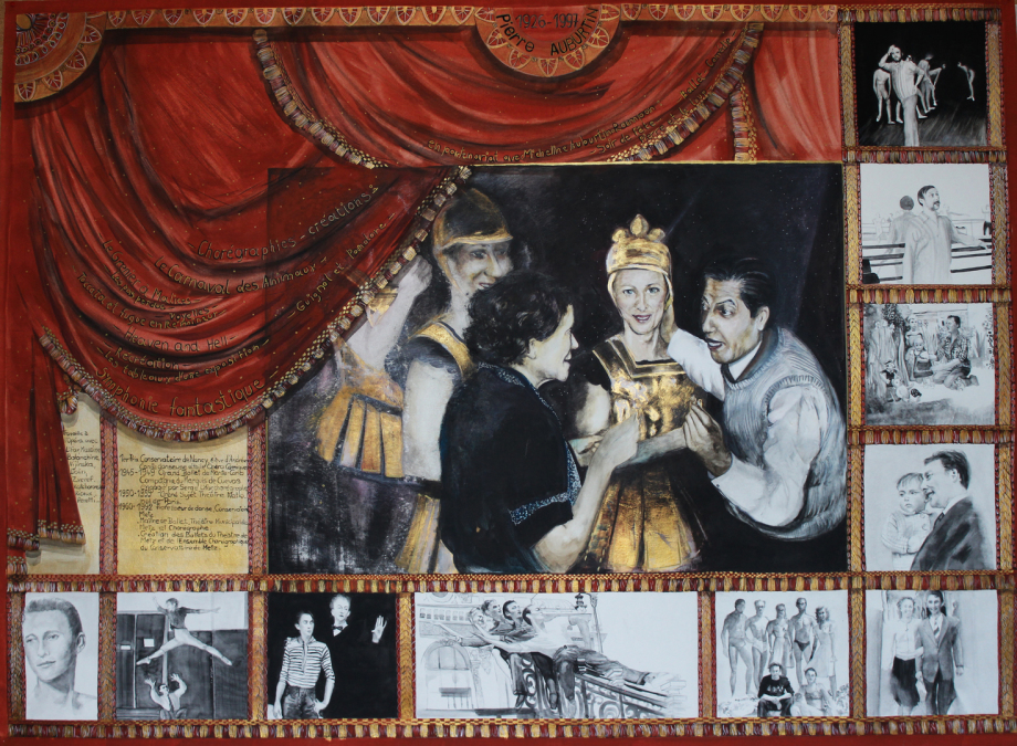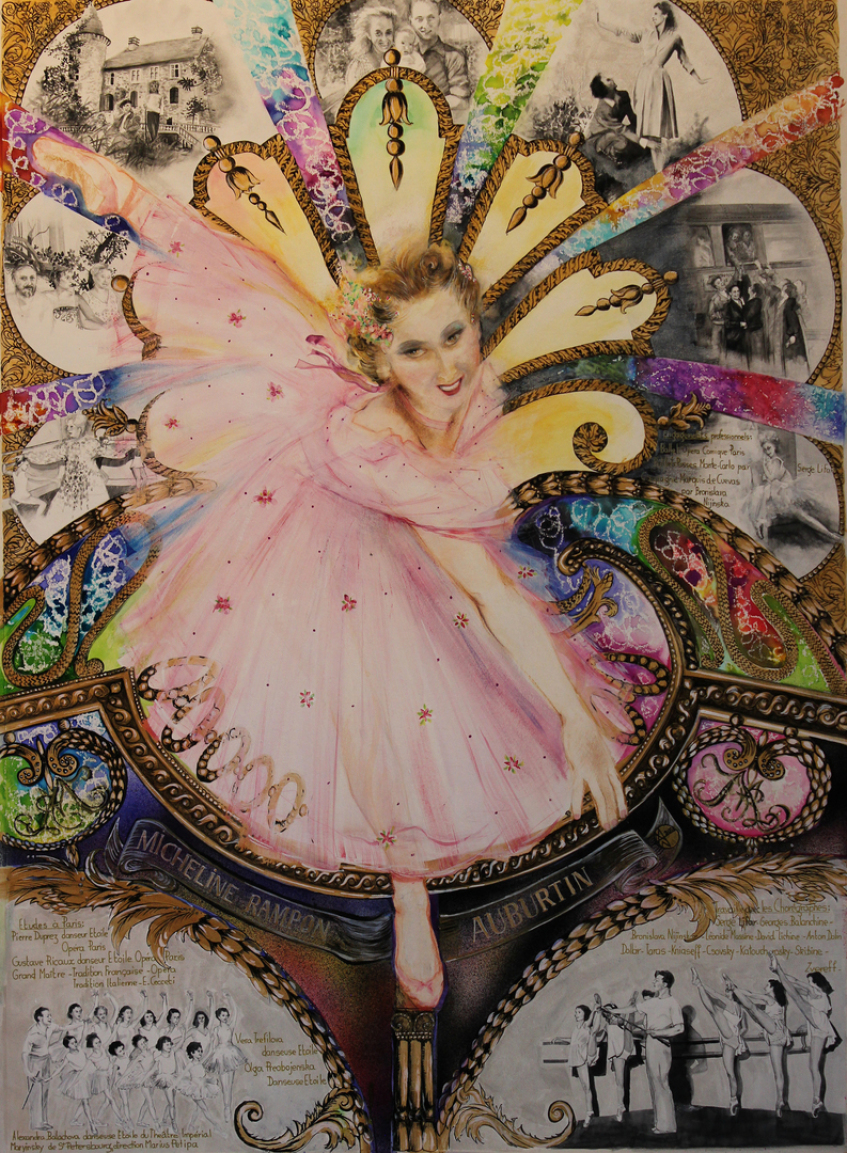 Micheline AUBURTIN née RAMPON   "La ballerine des temps passés" 08/04/1928 - 06/01/ 2018. Danseuse aux Ballets de Monte-Carlo (Serge Lifar), Ballets du Marquis de Cuevas de Monte-Carlo, Ballets de l'Opéra Comique de Paris. Professeur de Danse Classique au Conservatoire National de Région de Metz.  Aquarelle, acrylique, gouache, pastel sur papier format 84x110 cm.
