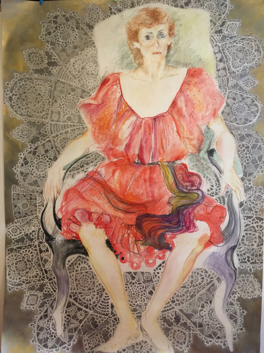 "Marie-France" dessin réalisé à Metz chez Marie-France,d'après nature en 1983, fusain couleur sur canson blanc 1m50x1m80. Fond retravaillé en 2017 à l'acrylique or et argent et dessin de dentelle au crayon mine de plomb.